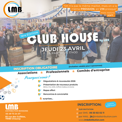 Le jeudi 23 avril 2026, LMB organise la première édition du “CLUB HOUSE by LMB”, un événement dédié à la découverte de solutions, produits et services pensés pour les associations, entreprises et organisateurs d’événements. Cette soirée marque le lancement d’un nouveau rendez-vous imaginé par LMB pour présenter ses nouveautés, partager son expertise événementielle et créer des moments d’échanges dans une ambiance conviviale et dynamique. Au programme : présentations, rencontres, dégustations et animations, le tout dans une atmosphère festive accompagnée par un DJ.
